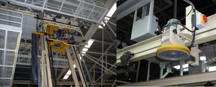 完整的摩擦输送机有轨道、直道驱动装置、弯道驱动装置、道岔、载货小车、停止器、定位器、钢结构系统、气路系统及电控系统构成,配以非标转挂设备可完成不同输送系统间的转运。